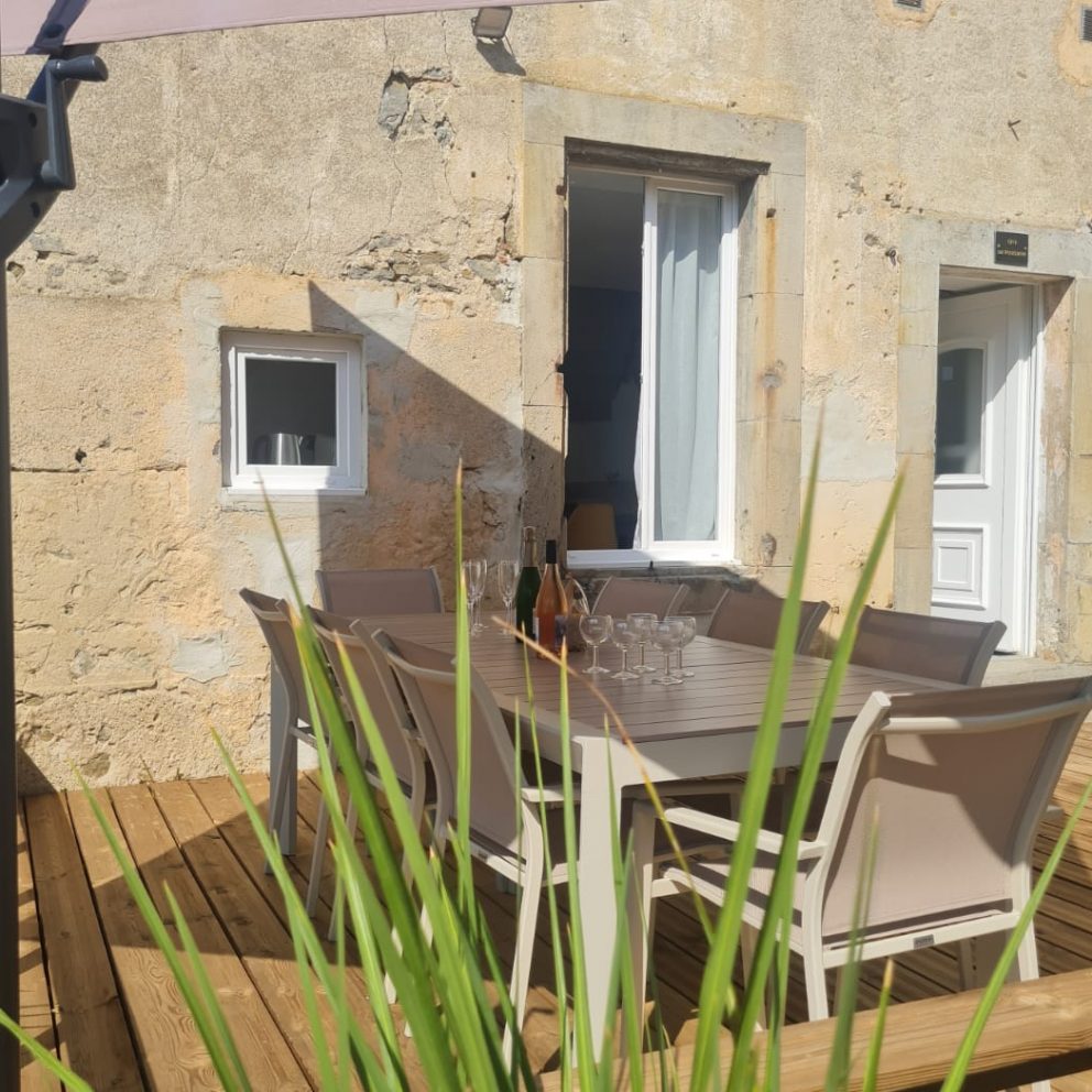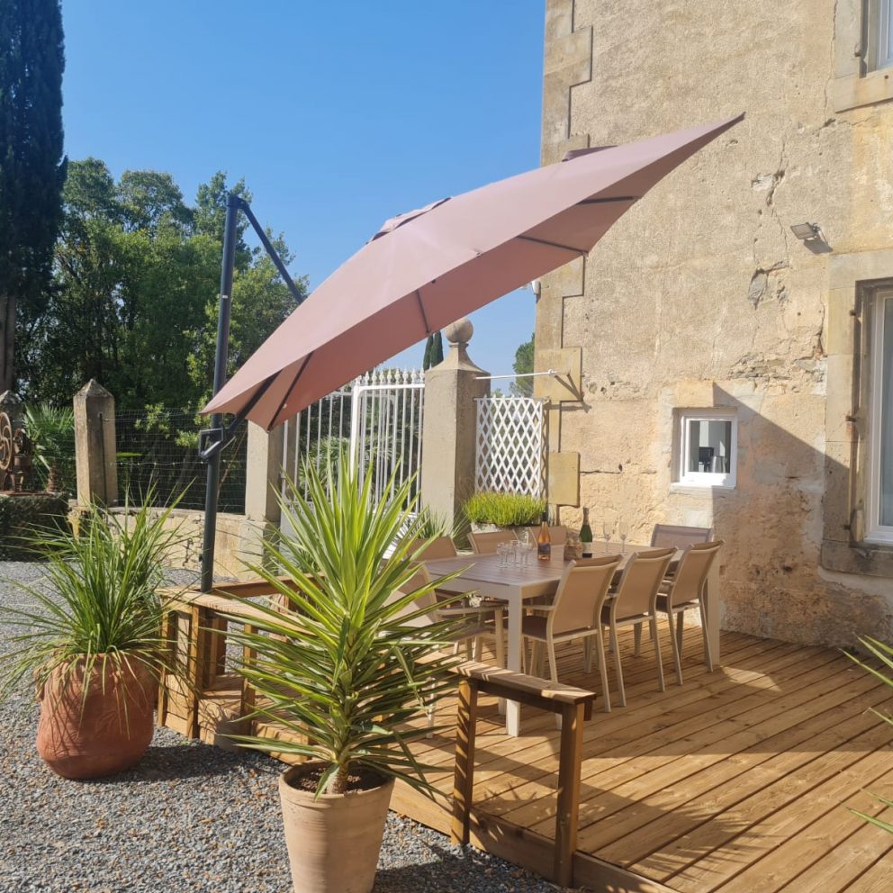 Cour intérieur & bar d’été – Un espace cocooning et nature au cœur du Château de La Seigne, idéal pour se détendre et savourer une boisson fraîche au bar d’été, dans une ambiance élégante et apaisante.